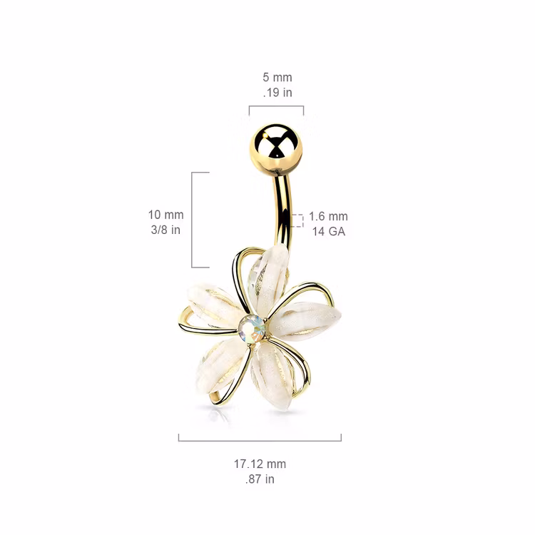 Navelpiercing med vit ädelstensblomma 115 kr Navelpiercing med push in topp och ädelstensblomma. Ädelstenarna är cubic zirconia stenar. Material: 316L Kirurg stål. Storlek: 1,6*10mm Färg Stål Guldpläterad Roséguldpläterad I lager. Lägg i korgen Dela Lagersaldo: Artikelnummer: 2010 Information Navelpiercing med push in topp och ädelstensblomma. Ädelstenarna är cubic zirconia stenar. Material: 316L Kirurg stål. Storlek: 1,6*10mm
