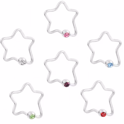 Cbr piercing i form av en stjärna. Cbr ringen är förmodligen det vanligaste piercingsmycket och har många användningsområden. Till ex. öra, navelpiercing, bröstvårta, näspiercing, ögonbrynpiercing, läpp, kvinnlig genital, mannlig genital. Bollen fungerar som ett lås, den hålls på plats av spänningen i ringen. 316L kirurg stål ring. Ringen är 1,6*21mm (måtten anger stavens tjocklek samt innerdiameter). Bollen är 5mm.